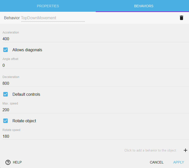 The "Top-Down Movement" behavior allows the additional functionality of moving an object in either 4 or 8 directions.