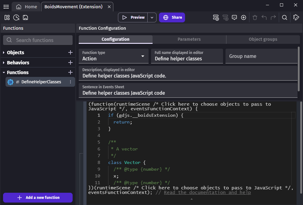 • JavaScript should be only used for code independent from GDevelop