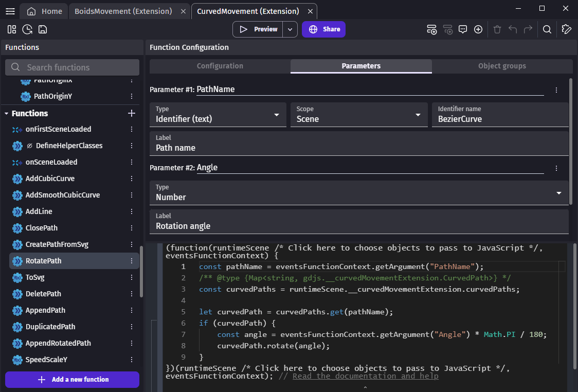 • The Curved movement extension evaluates Bézier curves using JavaScript and handles movement logics with events.