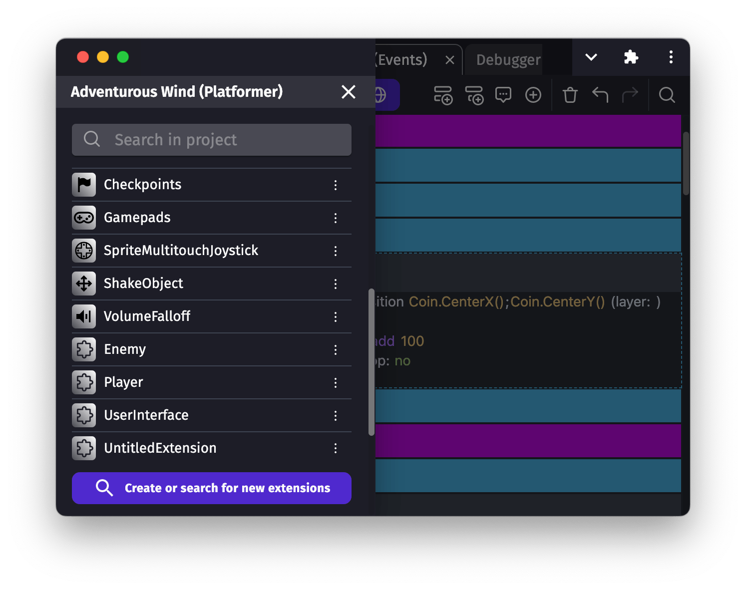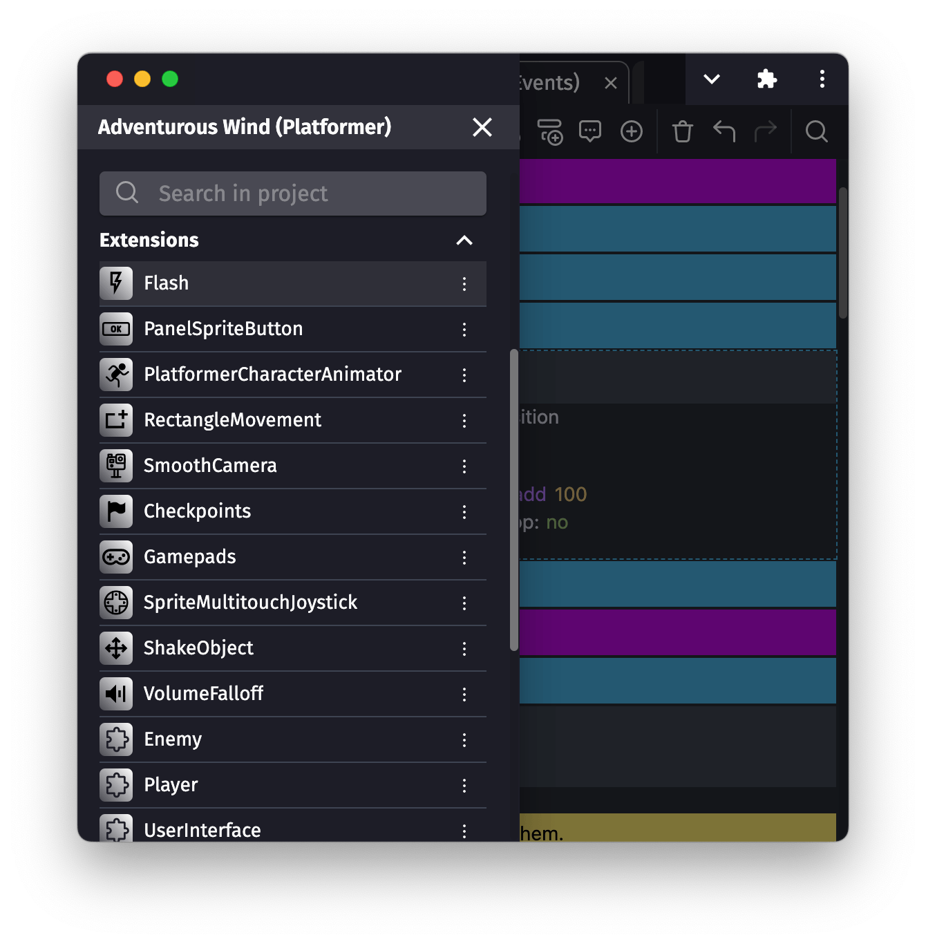 It's possible to easily create new extensions, using the same events that you're using in the scenes. It's a powerful feature that allows you to organize your game and extend your objects.