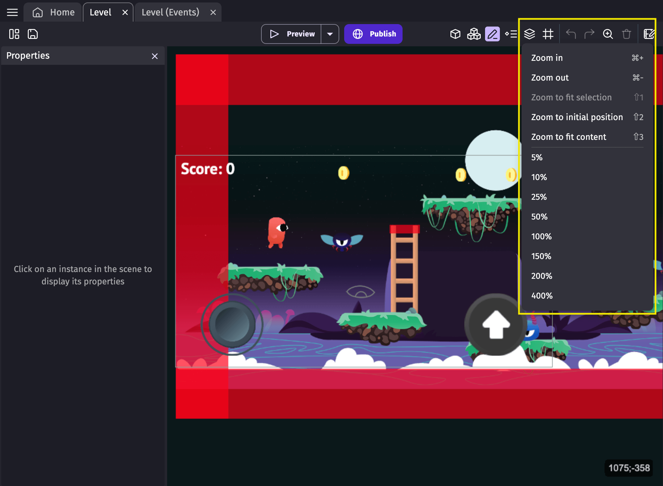 By clicking on the "Preview" button, you can launch a preview of your game.