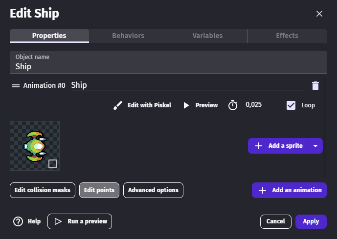 Points are reference locations that refer to a specific location around a sprite. Every sprite starts with two default points, named "Origin" and "Center". Each of these points can be moved from their default locations.