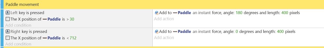 The player will control the paddle using the left and right arrows on the keyboard. You can create these controls using events (actions that occur if conditions are true).